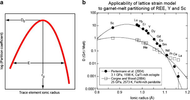 a Sketch showing parameters of the lattice-strain model (Eq. 1) in relation to the observed near-parabolic dependence of log(D) on trace element radius. b Examples of measured garnet-melt partition coefficients (symbols, data from Corgne and Wood (2003) and Pertermann et al. (2004) for REE, Sc, and Y showing parabolic behaviour. Curves are fits of Eq. 1 to the data