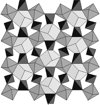 Two-dimensional projection of the build-up of the garnet and majorite structures, after Merli et al. (1995). Alternating isolated tetrahedra (black, enclosing the Z site) and octahedra (dark grey, enclosing the Y site) form a 3D corner-sharing network, with the resulting cavities forming dodecahedra (light grey, enclosing the X site)