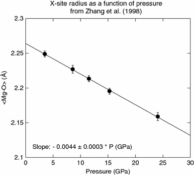 Variation of average Mg–O distance in Mg3Al2Si3O12 pyrope, <Mg–O>, as a function of pressure between 2.5 and 25 GPa, taken from single crystal X-ray diffraction refinements of Zhang et al. (1998)