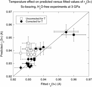 Comparison between predicted and observed values of r 0 for REE partitioning between garnet and anhydrous silicate melt at 3 GPa (taken from references listed in Table 1). Open symbols depict predictions using the r 0 model of van Westrenen et al. (2000a, b) (Eq. 2), showing significant overestimation of r 0 at low values of fitted r 0 (coinciding with experiments performed at relatively low temperatures). Linear regression analysis leads to the identification of a significant temperature effect on r 0. Incorporation of this effect into the predictive model for r 0 (filled symbols, obtained using Eq. 3) leads to significant reduction of the mismatch between observed and predicted values