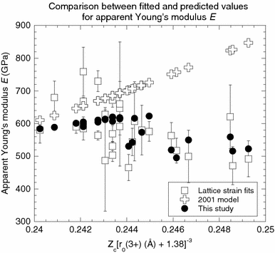 Comparison between fitted values of apparent Young’s modulus E (squares), predicted values from the 2001 model (crosses) and the new predictions using Eq. 4 from this study (circles). Error bars are 1σ