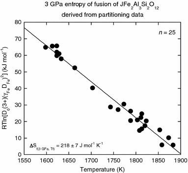 The entropy of fusion of \(\hbox{JFe}_2\hbox{Al}_3\hbox{Si}_2\hbox{O}_{12}, \Delta S_{{{\rm f}(P,T_{{\rm f}})}}^{0},\) can be estimated by analysing a set of partitioning experiments performed at constant pressure over a wide range of temperatures. In this case, the pressure terms in Eq. 16 are constant, and the right hand side of the equation can be calculated from measured values of garnet and melt major element composition, and fitted values of \(D_0. \Delta S_{{{\rm f}(P.T_{{\rm f}})}}^{0}\) can then be obtained from the slope of a plot of apparent free energy of fusion versus temperature.