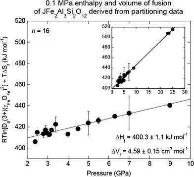 The apparent free energy of fusion of JFe2Al3Si2O12, corrected for temperature using the entropy of fusion derived in Fig. 7, plotted against pressure (symbols, derived from garnet-melt REE partitioning data for experiments listed in Table 1). The enthalpy and volume of fusion of JFe2Al3Si2O12 are obtained from the intercept and slope, respectively, of a least-squares linear fit to the data between 2.4 and 9 GPa. The inset shows how the extrapolation of this ‘low-pressure’ fit (line) agrees very well with the 23–25 GPa data points