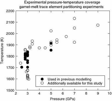 Pressure–temperature conditions of experimental garnet-anhydrous melt partitioning data sets used in this study, compared to the earlier work of van Westrenen et al. (2001) and Wood and Blundy (2002). Not shown are three data sets at 23–25 GPa and 2,573 K (Walter et al. 2004; Corgne and Wood 2004), included in this study and absent from the 2001 and 2002 data bases