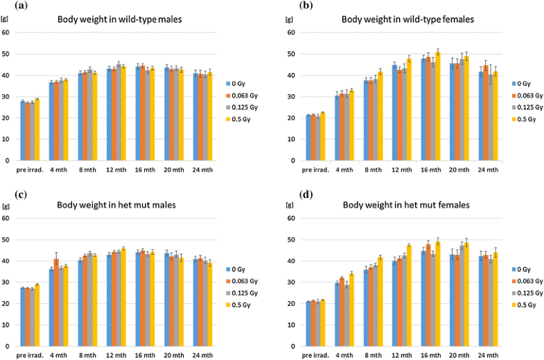 Body weight. Body weight was measured before irradiation (pre irrad.), and then every 4 months post-irradiation. There was no statistically significant difference between wild types and heterozygotes (p = 0.426), the development of body weight over the lifespan is shown for a wild-type males and b females as well as c heterozygous mutant (het mut) males and d females after different irradiation doses (color coded). Bars represent 10–20 mice, dependent on the survival (see Fig. 2). Error bars represent SEM