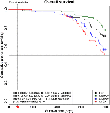 Kaplan–Meier analysis of the overall survival of the mice post-irradiation (p.i.). Kaplan–Meier plots of mice that were irradiated with 0.063 Gy (green), 0.125 Gy (blue) and 0.5 Gy (red) and sham irradiated (black; 0 Gy) are shown. Each group started with 80 mice. The 0.125 and 0.5 Gy groups showed reduced overall survival compared to the sham-irradiated group. Survival of the 0.063 Gy irradiated group was statistically not distinguishable from the sham-irradiated group (HR hazard ratio, CI confidence interval); mice were irradiated on day 70 (red), while the total lifetime was 800 days