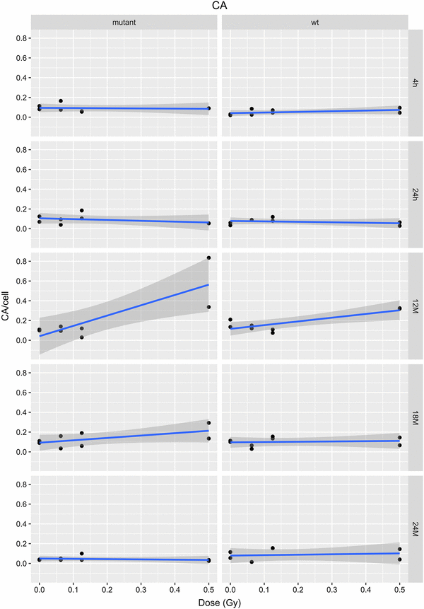 Radiation induces chromosomal aberrations such as dicentric and acentric chromosomes, rings and translocations (Romm et al. 2009; Wojcik et al. 2017). In our study, usually 50 metaphases were analyzed from fixed bone marrow cells of femurs of three or four individual mice. The data were pooled resulting in 150 or 200 metaphases per experimental point. There was no statistically significant difference 4 and 24 h after irradiation, but overall we noted a significant effect of the genotype showing a higher risk of chromosomal aberrations in the heterozygous mutants (p < 0.001; Fig. 3). The detailed analysis of the interaction of dose dependence and time after irradiation revealed that the differences were mainly due to the data observed 12 months after irradiation (for wild types and mutants: p < 0.001). 18 months after irradiation, a statistically significant dose-dependent increase of chromosomal aberrations was observed only for the mutants (p = 0.036), but no longer for the wild types (p = 0.816; Fig. 3). The total number of chromosomal aberrations is small due to the low dose and dose rate applied to the mice; nevertheless, this result is in line with the observation of a half-life time of 36 months for dicentric chromosomes in human cell culture (Beaton-Green et al. 2016) explaining the decrease of chromosomal aberrations 24 months after irradiation.