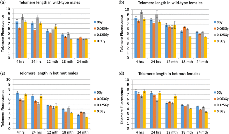 Irradiation with 0.5 Gy shortens the lifespan significantly, whereas the lower doses are without a significant effect. Interestingly, the lowest dose of radiation leads to an apparent, but statistically not significant increase of the lifespan. The reduced lifespan after irradiation with 0.5 Gy cannot be explained by shortened telomeres as we did not observe any significant changes in bone marrow cells dependent on the radiation dose. Generally, our observation of longer telomeres in female mice compared to male mice is in good agreement with the literature (Cherif et al. 2003; Gardner et al. 2014). Moreover, the shorter telomeres in the mutants are in line with previous studies: many DNA repair defective mouse models show abnormalities in telomere length (Slijepcevic 2006).