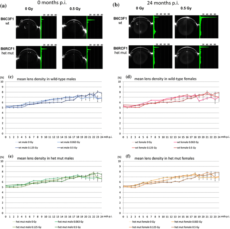 Scheimpflug analysis. The data of the Scheimpflug analysis of lenses are given immediately after irradiation (a) or 24 months later (b). The figure gives the extreme values (0 or 0.5 Gy) both for B6C3F1 wild-type mice (wt) and B6RCF1 heterozygous mutant mice (females only). The cornea (C) is on the top, and the lens (L) at the center. The bright areas at the left and right side of the eye show hairy skin. The green densitogram represents the percentages of opacity measured at the dotted line. The peaks represent (from top to bottom) the reflections at the cornea and the surface of the lens; 24 months after irradiation, the opacity of the mouse lenses increased slightly. Dose–response curves of mean lens densities of wild-type B6C3F1 males (c) and females (d) and heterozygous mutant B6RCF1 male (e) and female (f) mice post-irradiation (p.i.) with 0, 0.063, 0.125 or 0.5 Gy from the time of irradiation to 24 months later are given (color code). The lens opacities have been determined monthly using the Scheimpflug camera. Bars represent standard error of the mean (SEM); n ranges between 10 and 20 mice depending on the age