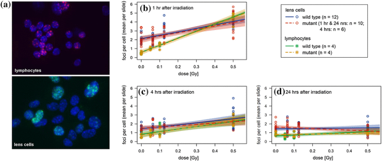 Linear regression models for the dose response with factors sex, genotype and their interactions with dose were fitted to γH2AX data for each time point and cell type separately. Therefore, differences in variances within the organs could not perturb the calculated effects. Since no sex effect was detected in lens cells, sex as a factor was removed from the lens model. In contrast, for lymphocytes sex and sex–dose interaction were included. Mean effect sizes and the corresponding standard errors were reported. Statistical significance was assigned for p < 0.05. All statistical calculations were performed using R (version 3.2.1).