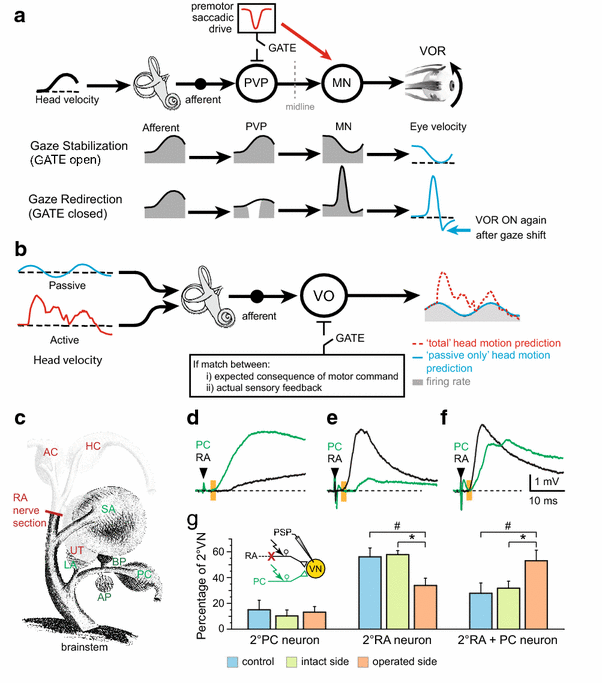 Task-dependent and lesion-induced plasticity of vestibulo-ocular reflexes during active and passive motion. a Schematic illustrating task-specific processing (gaze stabilization, redirection) in central vestibular PVP neurons and extraocular motoneurons. b Task-specific cancelation of vestibular sensory inputs by predictive signals during active (red) head motion in VO neurons. In contrast, vestibular sensory information is completely transmitted during passive (blue) head motion. c Schematic view of the frog VIIIth nerve with endorgans, nerve branches and site of RA nerve section. d–f Convergence of afferent inputs from the RA and PC nerve branches; monosynaptic responses were evoked in some 2°VN after stimulation of the PC nerve (green trace; d), in others after stimulation of the RA nerve (black trace; e) and in a third group after stimulation of both branches (f). g Percentages of the three types differ between controls and operated frogs and between intact and operated sides (color-coded bars). Black arrowhead and orange bars in d–f indicate stimulus and monosynaptic onset. AC, PC, HC anterior, posterior vertical, horizontal semicircular canal, AP, BP amphibian, basal papilla, LA lagena, RA ramus anterior of the VIIIth nerve, SA saccule, UT utricle, VN vestibular nuclei, VO vestibular-only neuron. c–g is based on data from [107]