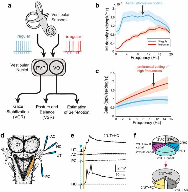 Over the range of frequencies typically experienced during everyday behaviors (i.e., up to 20 Hz), semicircular canal afferents encode head velocity while otolith afferents encode linear acceleration in mammals ranging from mice to primates [43, 44, 45]. Quantification of afferent responses in primates has revealed important differences not only in the dynamics of regular versus irregular afferent activity (i.e., irregular afferents have higher sensitivities and phase leads as shown in Fig. 1b), but also in their information coding (Fig. 1c). In monkeys, regular canal afferents transmit twofold more information and are twice as sensitive for detecting head motion compared to irregular afferents [46]. Thus, regular and irregular canal afferents essentially comprise two parallel information channels, one which encodes high-frequency stimuli with higher gains (i.e., irregular afferents), the other which transmits information about the detailed time course of the stimulus over the behaviorally significant frequency range (i.e., regular afferents). Interestingly, a different coding strategy is used by otolith afferents. Irregular otolith afferents are far more sensitive than regular otolith afferents, so much so that their differences in sensitivities are effectively compensated by differences in variability [45]. As a result, neuronal thresholds are independent of both stimulus frequency and resting discharge regularity.