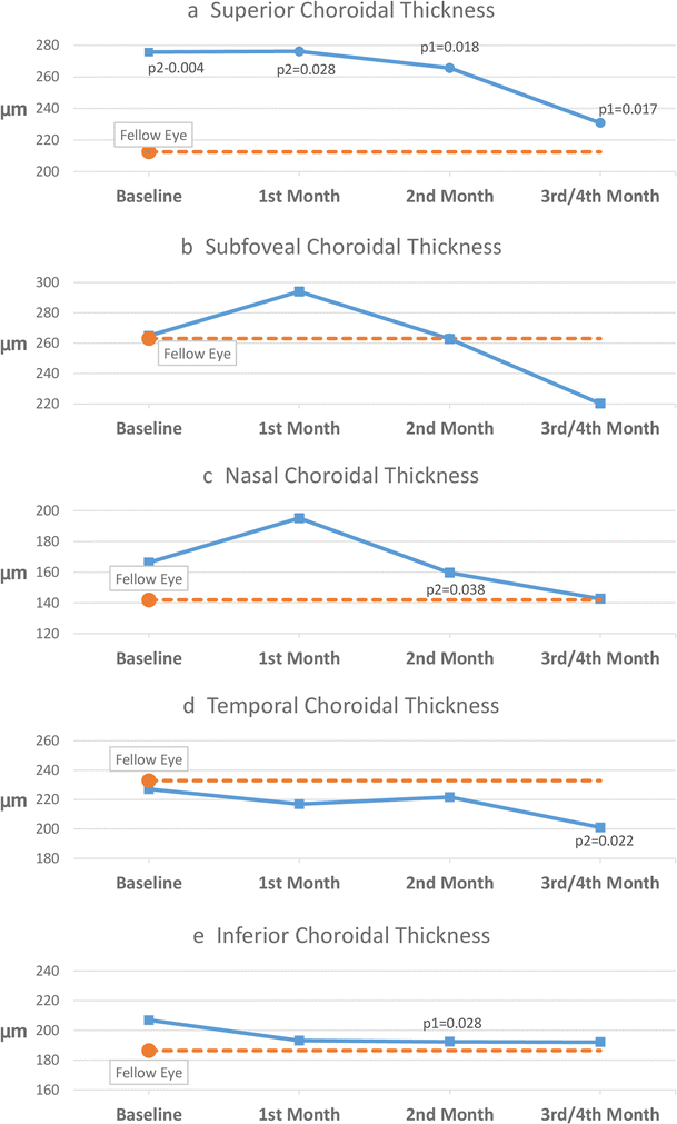 Macular choroidal thickness measurements (a Superior, b Subfoveal, c Nasal, d Temporal, e Inferior). Only significant p-values are shown. p1, p-value for comparison with baseline measurements in the study eye. p2, p-value for comparison with fellow eye measurements