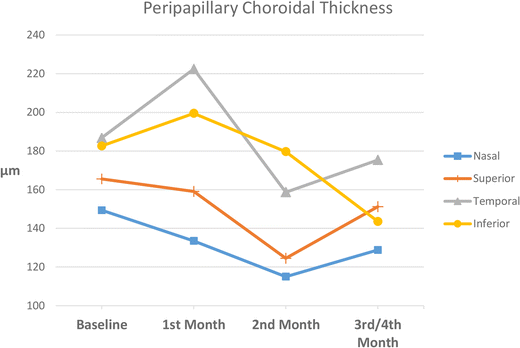Subfoveal and nasal macular choroidal thickness increased at baseline and 1st month exams and decreased at the 2nd and 3rd/4th month exams. These differences were not statistically significant (both for comparison with the control eye and comparison with baseline thickness in the study eye). Only one significant difference was shown in nasal choroidal thickness between study and controls eye at the 2nd month exam (see Fig. 2b and c). No specific pattern was shown in temporal and inferior macular thickness (see Fig. 2d and e).