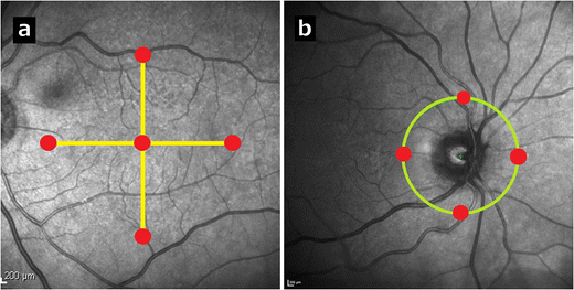 a. (Patient 13) A left eye infrared map of enhanced depth imaging (EDI) optical coherence tomography (OCT) foveal measurement locations (red circles) at the foveal center and 2.5 mm nasal, temporal, inferior, and superior to the foveal center. The yellow lines represent the OCT cross-sections. b. (Patient 1) A right eye infrared map of EDI-OCT peripapillary measurement locations (red circles) 1.75 mm nasal, temporal, inferior, and superior to the optic disc center. The yellow-green circle represents the OCT cross-section