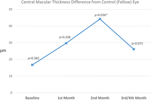 Central macular thickness difference from control (fellow) eye. *Significant p-values; p-values are for comparison with fellow eye measurements