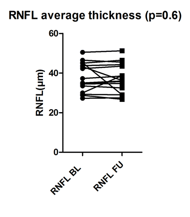 Scatter blot of average retinal nerve fiber layer (RNFL) thickness of the ETDRS outer rings in patients with glaucoma and neovascular age-related macular degeneration under long-term anti-VEGF treatment at baseline (BL) and last follow-up visit (FU). No significant changes were noted over time. (GIF 13 kb)
