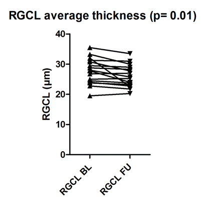 Scatter blot of average the retinal ganglion cell layer (RGCL) thickness of the ETDRS outer rings in patients with glaucoma and neovascular age-related macular degeneration under long-term anti-VEGF treatment at baseline (BL) and last follow-up visit (FU).at baseline (BL) and last follow-up visit (FU). Significant decrease of RGCL thickness was noted over time. (GIF 14 kb)