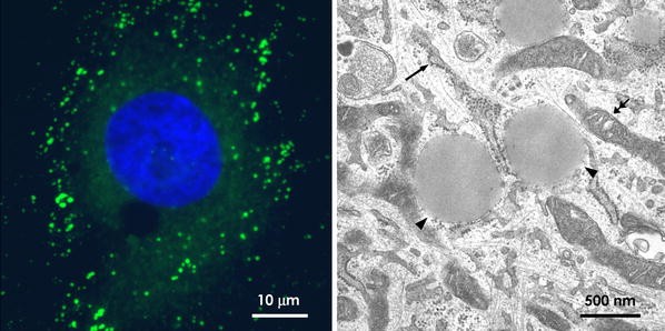The LD by light and electron microscopy. a Light microscopy. By labeling of rat 3Y1 fibroblasts loaded with oleic acid by BODIPY493/503 (green), LDs are observed as many small dots by fluorescence microscopy. The diameter of these dots is generally around 1 μm, and the smallest one is no less than 200–300 nm in diameter. The nucleus is stained by 4′,6-diamino-2-phenylindole (blue). b Electron microscopy. In conventional ultrathin sections, the LD is observed as a structure with a homogenous content (arrowheads). In contrast with ER (arrow) and mitochondria (double arrows), the LD surface is not delimited by the unit membrane