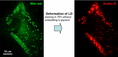 Deformation of LD by staining and embedding procedures. Staining by alcoholic dyes and embedding cause gross deformation of LDs. In this example, human fibroblasts cultured with oleic acid were fixed by formaldehyde, stained by Nile Red dissolved in phosphate-buffered saline (PBS) and was photographed in PBS (left figure). The same cell was further stained by Sudan III dissolved in 70% ethanol, mounted in a medium containing about 25% (w/v) glycerol, and photographed again (right figure). Although the overall distribution of the LD remained the same, LDs observed as a cluster of small LDs by Nile Red were grossly transformed to large LDs (often >5 μm in diameter) after the Sudan III staining, and the total area of the LD decreased by about 30–50%. A similar deformation was observed by the Oil Red O staining
