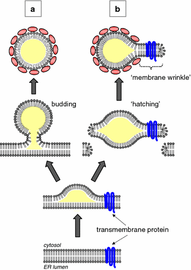 The separation of the nascent LD from the ER membrane is generally presumed to occur by budding and fission so that the surface of the LD originates from the cytoplasmic leaflet of the ER (Fig. 5a). The mechanism of the vesicular budding have been characterized [for reviews, see (McMahon and Mills 2004; Praefcke and McMahon 2004; Corda et al. 2006)], but a completely different mechanism may be needed for the LD because the content and surface of the LD have vastly different properties from that of vesicles. An alternative mechanism for LD formation was proposed recently: the nascent LD is hypothesized to form by “hatching”, in which the lipid ester globule detaches from the ER together with the two membrane leaflets (Fig. 5b) (Ploegh 2007). By this scenario, a transient pore is made in the membrane, and this may be important for misfolded proteins in the ER lumen to be translocated to the cytoplasm for proteasomal degradation. This hypothesis can explain the presence of ER proteins, especially for some transmembrane ones, in the LD (Dvorak et al. 1992; Bozza et al. 1997; Robenek et al. 2004, 2005) because the intact membrane fragment can remain attached to the LD as a wrinkle.