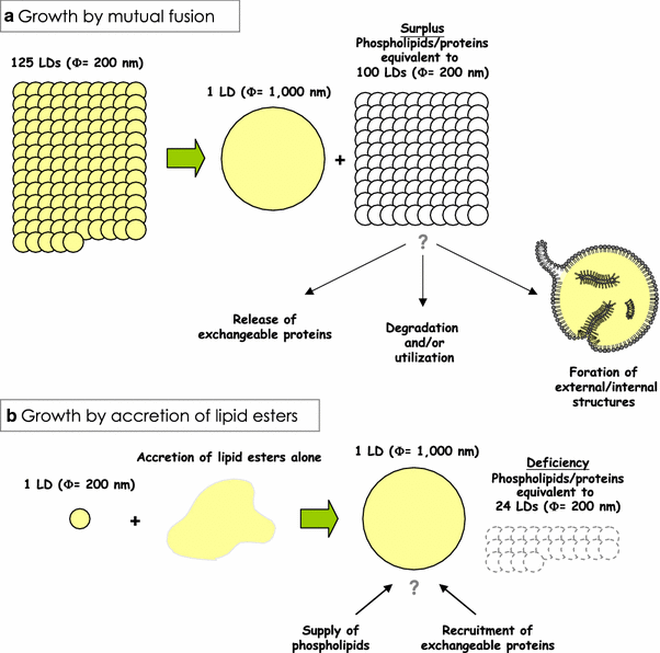The LD growth may cause changes in opposite directions. When the LD growth occurs solely by mutual fusion (a), a large surplus surface phospholipids and proteins should arise. This condition is likely to cause exchangeable proteins to leave the LD, whereas the constitutive proteins remain in the LD. The excess phospholipids and proteins might give rise to membranous structures in and/or out of the LD. On the contrary, when the LD grows by accretion of lipid esters in processes other than the mutual fusion (b), a deficiency of the surface phospholipids and proteins may occur, which may then recruit exchangeable proteins to the LD. Thus, the ratio of exchangeable and constitutive proteins in the LD could change to opposite directions depending on how the growth occurs