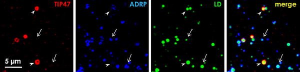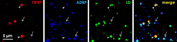 Heterogeneity of LD-associated proteins in a cell. Huh7 cells were multiple-labeled by BODIPY493/503 (green) and by anti-TIP47 (red) and anti-ADRP (blue) antibodies. The LDs marked by BODIPY493/503 are mostly positive for ADRP alone (arrows), although the intensity of the ADRP labeling is varied among LDs. On the other hand, TIP47 is seen only in a limited population (arrowheads)