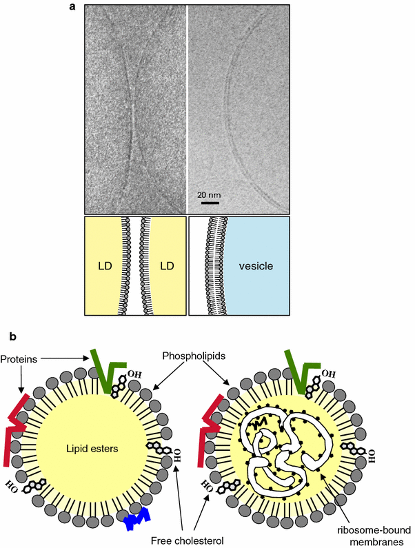 Basic architecture of the LD. a Cryoelectron microscopy of the isolated LD and vesicle. Isolated LDs from HepG2 cells were rapidly frozen and observed by cryoelectron microscopy at the liquid helium temperature without fixation or staining. The LD surface was seen as a single electron-dense line (left figure; two adjacent LDs are seen), whereas the surface of a membrane vesicle was observed as two parallel lines (right figure). The electron density is solely derived from a row of phosphorus in the phospholipid head group. The result demonstrated that the LD surface is made of a phospholipid monolayer as depicted in the lower diagram. b The LD core is generally thought to consist of the lipid ester alone (left diagram), whereas presence of the ribosome-bound membrane as well as several proteins in the core has been reported in some cells (right diagram)