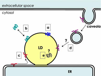 Proteins are transported and localized in the LD by different mechanisms. Proteins in the LD may be classified into at least five categories according to their transport and localization mechanism. a Perilipin and ADRP are constitutively localized in the LD. b TIP47, S3-12, and MLDP/OXPAT/PAT-1 exchange between the LD and the cytosol. c Caveolins and oleosins translocate from the ER membrane to the LD by lateral diffusion. d Caveolin-1 is endocytosed from caveolae and reaches the LD by an unknown mechanism. e The mechanism that causes some proteins to locate in the LD core is not known