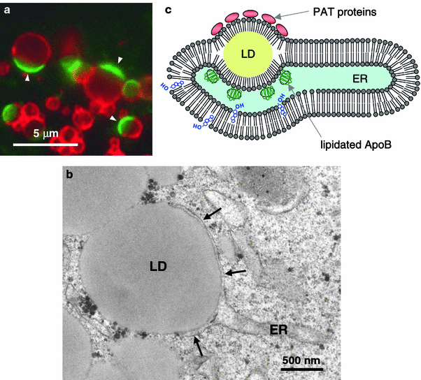 The LD arrested in the ER membrane. a The LDs harboring ADRP (red) on a hemisphere and apolipoprotein B-100 (green; arrowheads) on the complementary hemisphere. This structure was named as “ApoB-crescent”. The ApoB-crescent increased drastically when degradation of apolipoprotein B-100 is perturbed in the hepatoma-derived Huh7 cell. b Electron microscopy showed that the ApoB-crescent consists of an LD and a thin ER cistern (arrows) fusing each other. The LD of the ApoB-crescent is topologically equivalent to the lipid ester globule between the two membrane leaflets (see diagram in Fig. 5). c The structure shown in a and b probably represents the LD arrested at an intermediate stage of biogenesis, which is caused by tight binding of lipidated apolipoprotein B-100 to the ER membrane