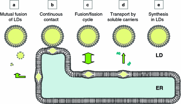 Possible mechanisms of LD growth. The pre-existing LD may grow by accretion of the lipid ester by one or several of possible mechanisms. a The LD is shown to fuse with other LDs; for the net increase of the total lipid ester, nascent LDs, too small to be detected by conventional methods, may ferry the lipid ester to the pre-existing large LDs. b The LD may remain continuous to the mother ER membrane and thus obtain the additional lipid ester through the conduit. c The LD may be connected to the ER transiently, while the two organelles undergo a cycle of fusion and fission. d Soluble complexes may carry the lipid ester to the LD. e The lipid ester may be synthesized locally in the LD