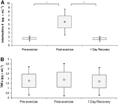 Interleukin 6 a and tumor necrosis factor α b levels in rowers at baseline, immediately after exercise, and after a 1-day recovery period. Data are presented as mean ± SEM. *Statistically significant difference between trials (p < 0.05)