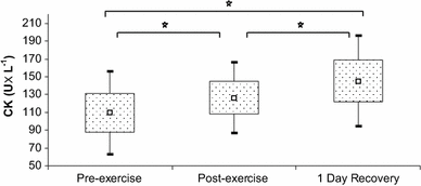 Creatine kinase levels at baseline, immediately after exercise, and after a 1-day recovery period. Data are presented as mean ± SEM. *Statistically significant difference between trials (p < 0.05)