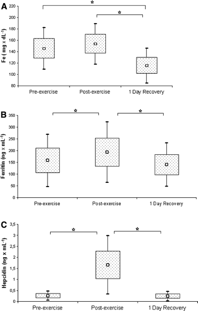 A 24-h recovery period resulted in a marked decrease in iron level in our participants, compared with both pre- and post-exercise levels (Fig. 1a). Reinke et al. (2012) observed that a considerable proportion of elite rowing athletes and professional soccer players have iron deficiency, independent of the training mode. However, only rowers exhibit lower erythrocyte counts and hemoglobin levels during pre-season training than during the recuperation period. According to Nemeth et al. (2004), impaired hemoglobin synthesis can result from a transient increase in hepcidin activity, which causes rapidly decreasing plasma iron levels and resultant anemia.
