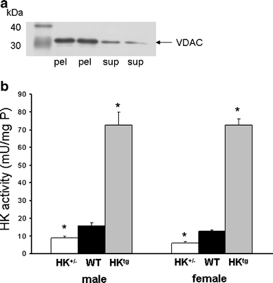 a Western blot showing mitochondrial enrichment of the 10,000 g pellet (pel) as compared with the 10,000 g supernatant (sup) fraction using VDAC (∼32 kDa) as mitochondrial marker; the first lane of the blot represents the molecular ladder. b Hexokinase activity in the mitochondrial fraction of the contralateral gastrocnemius medialis muscle of the hexokinase-knockout (HK+/-), wild-type (WT), and hexokinase-overexpressed (HKtg) male and female animals. Values are given as mean ± SEM. *p < 0.05 versus WT of similar gender