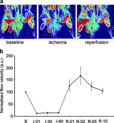 Perfusion monitoring of the GM by laser speckle imaging. a Representative baseline, ischemia, and reperfusion laser speckle images of both hindlegs. The white oval indicates the position of the GM. Level of perfusion is scaled from blue (low perfusion) to yellow (medium perfusion) and finally to red (high perfusion); b Normalized blood flow velocities, relative to baseline values, of the GM muscle subjected to ischemia–reperfusion by ligation and release of the artery femoralis. B baseline, I ischemia at 1 (01), 30 (30), and 60 min (60), R reperfusion at 1 (01), 2 (02), 5 (05), and 10 min (10). Values are given as mean ± SEM