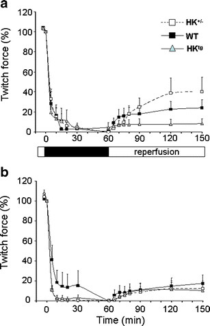 Twitch force production of the GM during baseline, ischemia (dark bar) and reperfusion for the HK+/-, wild-type (WT), and hexokinase-overexpressed (HKtg) male (Fig. 3a) and female (Fig. 3b) animals. Twitch force is normalized to values measured at end of baseline (t = 0 min). Values are given as mean ± SEM