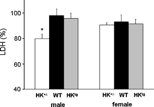 In the present study, we make use of the twitch-stimulated ischemia–reperfusion model, reducing experimental ischemic duration from 2–7 h to 40 min and allowing examination of functional performance during and after ischemia [27]. The maintenance of a relatively high ambient temperature (37°C) together with continuous activation of the muscle during ischemia accelerates the deterioration of energy metabolism and makes it comparable to prolonged noncontracting ischemia–reperfusion interventions [27]. That I/R injury was present is demonstrated by the low recovery of force production upon reperfusion (20–40%). However, cell death was minimal as reflected by the non-significant change in LDH present in the reperfused muscle in comparison with the contralateral muscle of the WT. That this was not due to incomplete ischemia or poor reperfusion was demonstrated by the speckle laser imaging experiments on blood flow velocities in the GM, showing large decreases in blood flow velocities during ischemia and complete restoration of blood flow velocities during reperfusion. Thus, despite the previous demonstrated depletion of high-energy-phosphate compounds and sharp deterioration of force production during ischemia and poor force recovery during reperfusion, the I/R insult was still rather mild. Nonetheless, the mild I/R intervention was severe enough to invoke significant cell death in the GM of the HK+/- male.