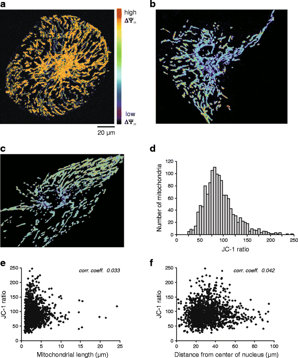 Heterogeneity of ΔΨm within the mitochondrial population. a–c TPLSM images of JC-1-labeled mitochondria. Displayed are the calculated ratios of red and green JC-1 fluorescence (ratio = F red*5/F green). With the superior contrast and apparent resolution of two-photon imaging, the ratiometric approach allows for a quantitative analysis of ΔΨm on the level of individual mitochondrial structures (granules, filaments). Note that ΔΨm clearly differs within the mitochondrial population. Scaling is identical for all three images. d Analyzing the ΔΨm of individual mitochondria (quantified as JC-1 ratio) shows a bell-shaped distribution with various grades in between functional and depolarized. Data are based on 1,373 individual mitochondria in 23 randomly chosen astrocytes. e A correlation of mitochondrial length and ΔΨm (JC-1 ratio) could not be proven (n = 1,373 mitochondria; 23 astrocytes). f A correlation of the distance of a given mitochondrion from the nucleus and its ΔΨm does not exist either. Note, however, that the variability of ΔΨm seems less pronounced for those mitochondria located within 15 μm of the center of the nucleus