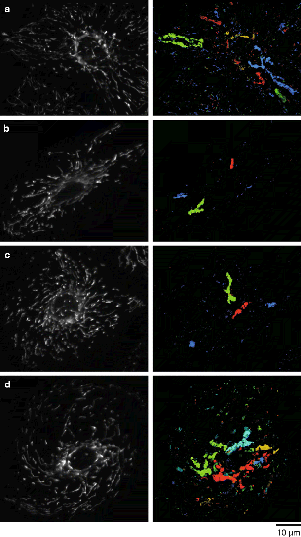 Subcellular activity correlation imaging (ACI) reveals synchronized ΔΨm fluctuations. a–d ACI analyses identified those mitochondria undergoing synchronized ΔΨm fluctuations. The left image of each pair displays the JC-1 labeled mitochondria (CCD camera/Dual-View imaging, red JC-1 channel) and the right image shows the corresponding correlation map. Those mitochondria showing synchronized ΔΨm fluctuations (correlation coefficient >0.5) are plotted in the same color. Up to five different large groups of synchronized mitochondria could be identified in a given cell. Comparison of the displayed cells reveals the individual organization and extent of the different groups of synchronized mitochondria. Scaling is identical for all panels