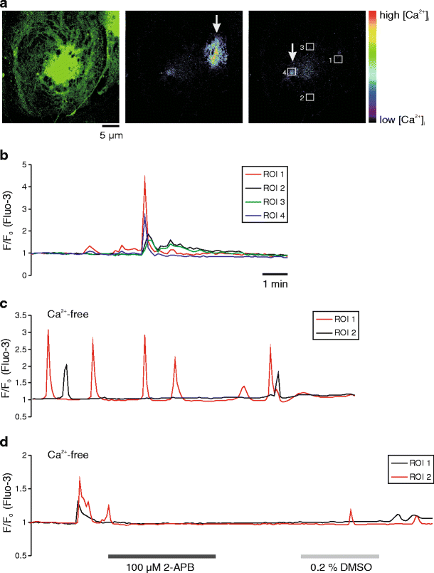 Fluo-3 recordings confirm the existence of intracellular localized Ca2+ transients. a TPLSM image of a fluo-3-labeled astrocyte and subtraction images (middle and right panel) showing perinuclear Ca2+ transients in pseudo colors. The arrows identify two Ca2+ microdomains; the four regions of interest analyzed are indicated. b Time course of normalized fluo-3 fluorescence analyzed within four perinuclear regions of interest (ROI) of the astrocyte displayed in a. Increases in fluo-3 fluorescence report a rise in [Ca2+]i. Time scaling is identical for b–d. c Administration of Ca2+-free solutions did not abolish the spatially confined Ca2+ changes, ruling out an influx of Ca2+ from extracellular space as the underlying mechanism. The plotted fluo-3 transients represent Ca2+-microdomains (ROI 1 and 2) recorded by CCD camera/Dual-View imaging from two neighboring astrocytes. d In the presence of 2-APB (100 μM), the local Ca2+ fluctuations were reversibly blocked, suggesting an involvement of the ER. The solvent DMSO itself (0.2%) did not affect [Ca2+]i