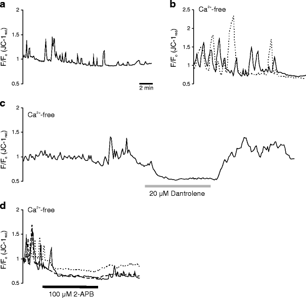 ΔΨm fluctuations are triggered by Ca2+-release from the ER. a Under control conditions, ΔΨm fluctuations were regularly observed. Plotted is the normalized red JC-1 fluorescence as detected by CCD-camera/DualView imaging; time scaling is identical for all panels. b The ΔΨm fluctuations continued despite withdrawal of extracellular Ca2+, suggesting independence of Ca2+ influx from extracellular space. Solid and dashed lines represent different mitochondria analyzed. c Administration of dantrolene (20 µM) antagonized the ΔΨm fluctuations, confirming an involvement of the ER as intracellular Ca2+ store. d Treatment with 2-APB (100 µM) also abolished the ΔΨm fluctuations of the three mitochondria analyzed