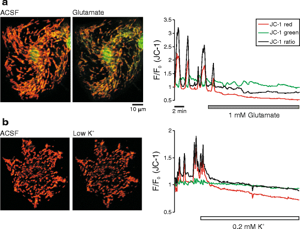 Challenging mitochondria by voltage-dependent and voltage-independent Ca2+ transients. a Glutamate (1 mM) depolarized the mitochondria and blocked the ΔΨm fluctuations. Plotted are the normalized red and green JC-1 fluorescence as well as the normalized JC-1 ratio of an individual mitochondrion (CCD camera/Dual-View time-lapse recordings). The TPLSM images show the overlay of red and green JC-1 fluorescence. Scaling is identical for all images/traces. b Lowering [K+]o to 0.2 mM depolarized mitochondria and depressed ΔΨm fluctuations, indicating that it is not the depolarization of the astrocyte but rather the Ca2+ load which modulates mitochondrial function