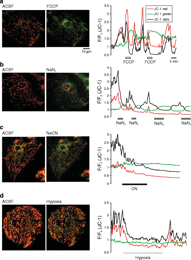 Pharmacological targeting of mitochondria antagonizes ΔΨm fluctuations, but does not evoke equally severe ΔΨm changes within the mitochondrial population. a Mitochondrial uncoupling with FCCP causes a massive loss of ΔΨm, but not the entire mitochondrial population was fully depolarized. TPLSM images show the overlay of red and green JC-1 fluorescence, plotted traces of JC-1 fluorescence were extracted from CCDcamera/Dual-View time-lapse recordings. b Block of complex IV by NaN3 (2 mM) also markedly depolarized mitochondria and the ΔΨm fluctuations ceased. Some mitochondria remained, however, partly depolarized. c Inhibiting complex IV by CN− (1 mM) depolarized mitochondria and blocked the ΔΨm fluctuations. Again, not all mitochondria showed equally severe depolarizations. d Oxygen withdrawal resulted in a marked depolarization of some mitochondria only. Nevertheless, the ΔΨm fluctuations were abolished and returned upon reoxygenation
