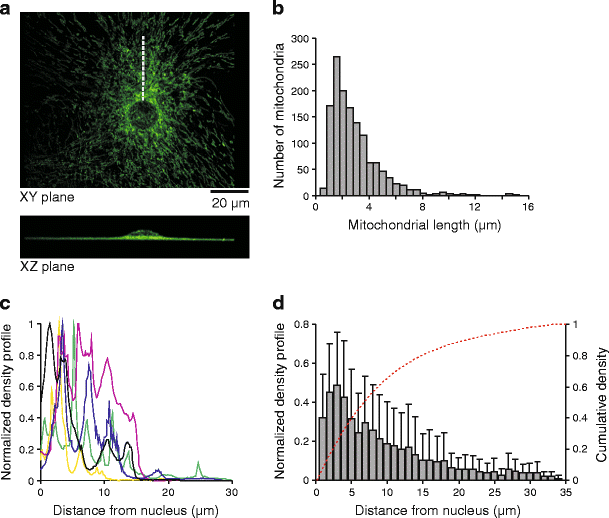 Subcellular heterogeneity of mitochondrial distribution and shape. a Distribution of Rh123-labeled mitochondria in a cultured hippocampal astrocyte. Note the variable shape of the individual mitochondrial structures and their dense packing around the nucleus. Mitochondria were visualized with a custom-built two-photon laser scanning microscope (TPLSM) using a 63× objective and 800-nm excitation wavelength; the dashed line resembles a typical line of interest along which the density distribution of mitochondria was calculated. Shown is a 3-dimensional reconstruction composed of 45 optical planes (z-distance 0.25 μm, 250-nm pixel resolution). b Frequency distribution of mitochondrial lengths (bin width 0.5 μm), as analyzed from 1,373 individual JC-1-labeled mitochondria in 23 randomly chosen astrocytes. c Mitochondrial density profiles showing that the mitochondrial packing is highest within a 15-μm perimeter around the outer edge of the nucleus and then drops off towards the cellular periphery. The five displayed profiles were calculated along lines of interest, spanning from the edge of the nucleus (distance 0) to the periphery (see dashed line in a) and normalized to the most intense density detected in each profile. d Summary of mitochondrial density. Plotted is the normalized averaged mitochondrial density profile of 39 randomly chosen cells (mean ± standard deviation). The cumulative density curve (dashed curve) shows that 50% of mitochondria are within 8 μm of the nucleus