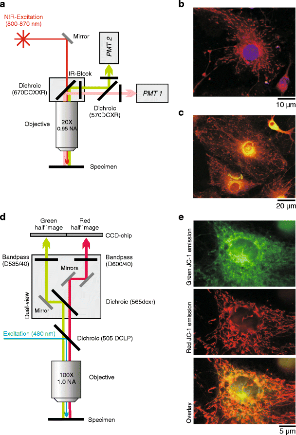 Dual emission imaging of mitochondrial arrangement and ΔΨm. a General system layout of the TPLSM. Fluorescence emission is spectrally separated onto the two single-photon counting photomultiplier tubes (PMTs) by a dichroic (e.g., 570 nm beamsplitter to separate green and red JC-1 fluorescence) and appropriate emission bandpass filters. b The visualization of MitoTracker Red-labeled mitochondria and the DAPI-labeled nucleus (shown in blue) confirms the perinuclear clustering of mitochondria. c Colocalization of MitoTracker Red-labeled mitochondria (shown in red) and the ER-Tracker Blue-White DPX-labeled ER (shown in green). The overlap of red and green structures suggests that especially perinuclear mitochondria are in close contact with the ER. d General principle of the image splitter device (Dual-View) used for longer time frame ratiometric imaging. The Dual-View is equipped with the appropriate dichroic and bandpass emitters to spectrally separate green and red JC-1 fluorescence and to project the resulting half-images side by side onto the CCD camera chip. e Comparing the green and red half-images enables colocalization and ratiometric studies to analyze mitochondrial heterogeneity and ΔΨm fluctuations within a cell