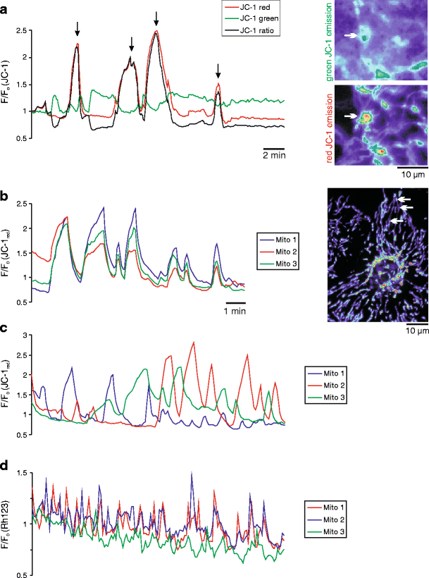 Spontaneous ΔΨm fluctuations in mitochondrial clusters and individual mitochondria. a Time-lapse recording (CCD camera/Dual-View, frame rate is 0.2 Hz) of synchronized ΔΨm fluctuations in a cluster of densely packed mitochondria. Note the opposite changes in red and green JC-1 fluorescence. Black arrows identify episodes of increased mitochondrial potential. The displayed images show the perinuclear mitochondrial cluster that was analyzed. b Plotted is the red JC-1 fluorescence of three individual mitochondria (arrow marks) which undergo spontaneous ΔΨm fluctuations. The rise in red JC-1 fluorescence indicates periods of increased mitochondrial energization. Even though spatially separated mitochondria were analyzed, their ΔΨm fluctuations are synchronized (correlation coefficients Mito1/2 = 0.58, Mito1/3 = 0.93, Mito 2/3 = 0.81). Time scaling is identical for b–d. c Desynchronized ΔΨm fluctuations of another three individual JC-1-labeled mitochondria. d ΔΨm fluctuations also occurred in Rh123-labeled mitochondria, yet the frequency was higher than with JC-1. Note also that Rh123 was more prone to photobleaching