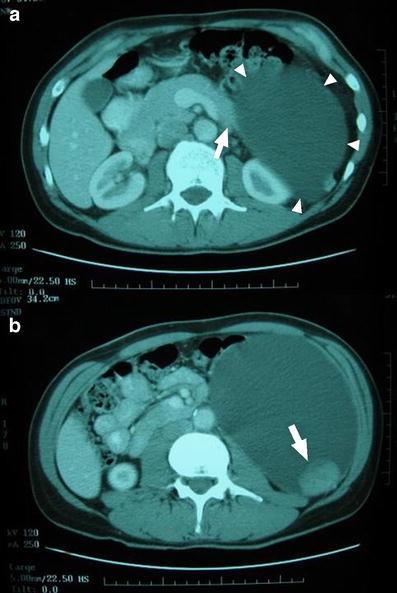 Contrast enhanced CT scan shows images of a pancreatic cyst (arrowheads) originating from the tail of the pancreas (a) and a mural nodule within the wall of the cystic mass (b)
