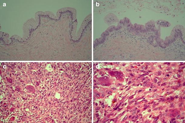 Cyst wall with typical tall columnar mucous-secreting epithelium and fibrous wall (a). Low cellular proliferation with some stratification of the cells and slight nuclear atypia (b). Heterogenous proliferation of pleomorphic cells, spindle cells, osteoclast-like giant cells, and some mononuclear cells with some pigment (c). Detail of sarcoma-like nodule (d)
