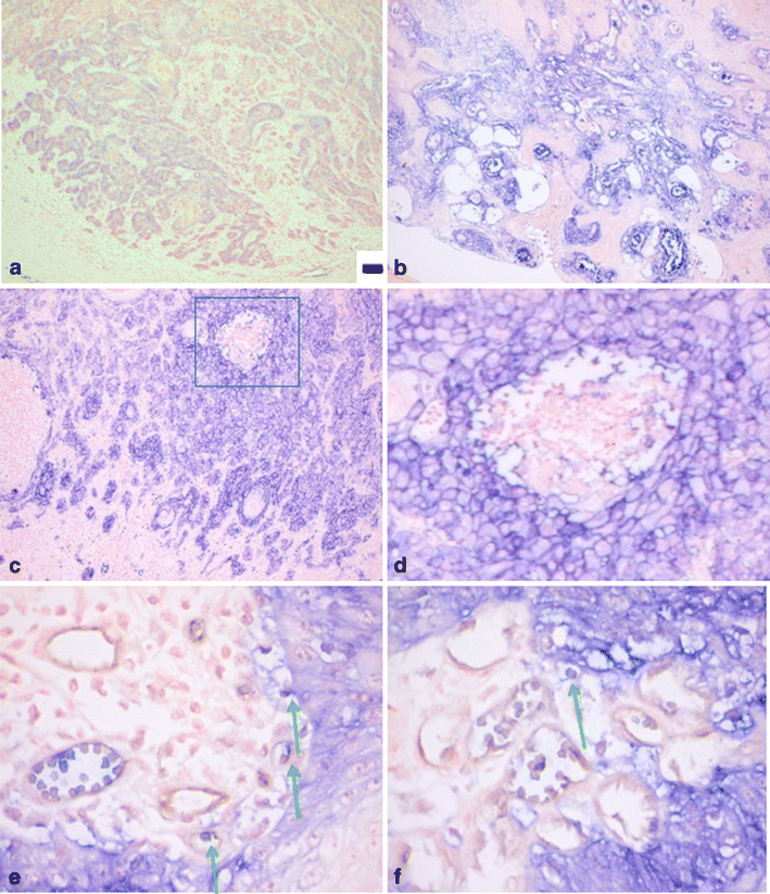 GLUT-1 staining in vulvar squamous cell carcinomas. Representative image of a negative staining (a), 40% (b), and 90% positivity (c). High-power magnification (d) of indicated area in (c) demonstrates clear membranous localization. Scale bars (a)–(c): 50 μm, (d): 10 μm. Membranous GLUT-1 staining of tumor cells (blue) adjacent to erythrocyte-containing blood vessels (red) can be observed (e and f). Erythrocytes are GLUT-1 positive and serve as an internal control for positive staining. Microvessels, where diffusion can occur, are indicated (arrows)